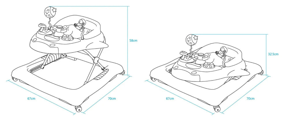 Il girello Positano è dotato di vassoio gioco con suoni e luci, il volume dei suoni è regolabile. Portata max kg12, età consigliata 6+mesi.