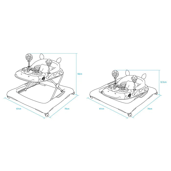 Il girello Positano è dotato di vassoio da gioco con suoni e luci, il volume dei suoni è regolabile. Portata max kg12, età consigliata 6+mesi.