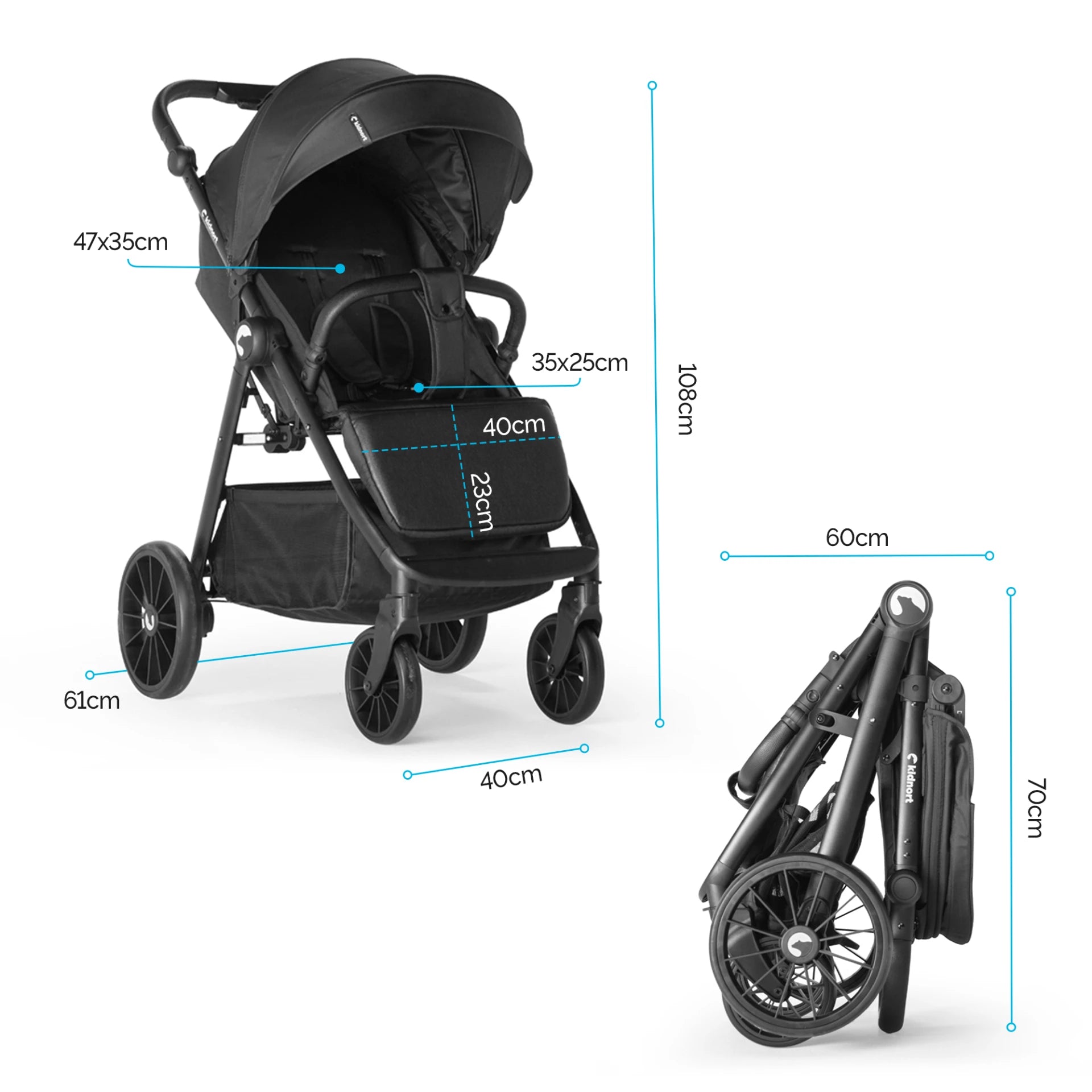 Si apre e si chiude facilmente con un solo pulsante. Una volta chiuso, può essere riposto in posizione verticale. Per la comodità dei genitori, sono presenti una tasca aggiuntiva sul retro dello schienale e un cestino portaoggetti sotto il passeggino.